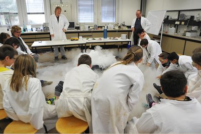 Beeindruckt zeigten sich Niklas, Jan-Luca & Co. besonders von flüssigem Stickstoff als Kühlmittel. Binnen weniger Sekunden ließ sich damit ein Luftballon, ein Schlauch oder auch eine Rose einfrieren bzw. „schockgefrieren“, wie es Dr. Adams ausdrückte. Erzeugter Nebel riss die Schüler anschließend sogar von den Sitzen. „Hat euch der Unterricht in der Universität gefallen?“ „Echt cool“, fasste Niklas die Meinung der Klasse zusammen. Angesichts des Themas Kälte hätte die Antwort nicht trefflicher ausfallen können.