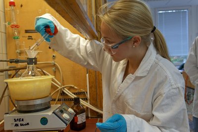 Die Speicherung elektrischer Energie in Batterien ist eine technische Teilantwort. Die Leistungsfähigkeit von Batterien vermaßen die Schülerinnen und Schüler - nach einem einleitenden Vortrag von Dr. Andreas Czymai - an Batterietestprüfständen. Danach wurde eine zweite Option vorgestellt, das Problem der Speicherung und zuverlässigen Verfügbarkeit elektrischer Energie zu lösen: die Umwandlung von Biomasse in Biogas sowie die Umwandlung von Biomasse in Biokraftstoffe (Biodiesel und Bioethanol). Die Chemie dieser Prozesse lernten die Gäste unter Leitung von Sascha Wiechmann, Doktorand am Institut für Organische Chemie, in vielen, selbst durchgeführten Experimenten kennen.