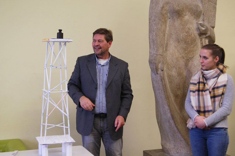 Die Aufgabe für die Studierenden des Wettbewerbs lautete konkret: Es sollte ein möglichst leichter Turm aus Papier gebaut werden, der eine Grundfläche von maximal 30 mal 30 Zentimeter hat und in einem Meter Höhe ein Gewicht von 1000 Gramm trägt. Die Last sollte in der Bewertung nicht mittig, sondern exzentrisch platziert werden. „Diese exzentrische Belastung soll bei realen Gebäuden den Umstand berücksichtigen, dass nicht nur vertikale Lasten infolge von Eigengewicht, Verkehrsbelastungen und Schnee auf ein Bauwerk einwirken, sondern auch Horizontalbelastungen wie Wind auftreten. Dadurch stellt sich insgesamt eine ausmittige Last ein, die vom Gebäude getragen werden muss“, erklärte Professor Meyer vom Institut für Geotechnik und Markscheidewesen, Abteilung Geotechnik und Ingenieurbau. Den Konstruktionswettbewerb führte er mit wechselnden Aufgaben bereits zum elften Mal durch.