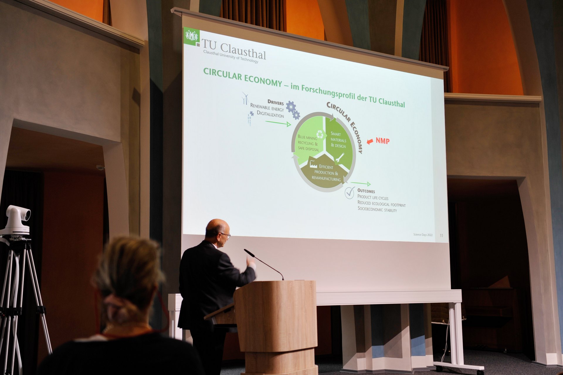 Beim Premieren-Science-Day stellte Prof. Daniel Goldmann, der neue Vizepräsident für Forschung, Transfer und Transformation der Universität, das Forschungsfeld „Neuartige Materialien und Prozesse für wettbewerbsfähige Produkte“ in den Kontext des Clausthaler Leitthemas, der Circular Economy. Dabei skizzierte er zunächst die Ausgangsposition: Die Weltbevölkerung wächst – Prognosen gehen als Höhepunkt von elf Milliarden Menschen aus. Gleichzeitig steigt der Ressourcenverbrauch pro Kopf drastisch an, erschwerend kommen Großkrisen wie aktuell Corona und der Ukraine-Krieg hinzu. „Die verantwortungsbewusste Antwort der TU Clausthal darauf ist die Circular Economy“, so Goldmann, „die ressourceneffiziente Kreislaufwirtschaft.“ Für die Anforderungen an die Materialien der Zukunft bedeutet dies: Sie müssen innovativer sein, umweltverträglicher, anwendungsoptimiert, energie- und ressourceneffizienter, wiederverwertbar, sozial verträglich in der Produktion, langlebig und möglichst kostengünstig.