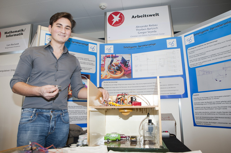 Überzeugt hatten die Goslarer Gymnasiasten die Juroren mit ihrer Idee, eine Sprinkleranlage zu entwickeln, die sich selbstständig auf den Brandherd ausrichtet und damit Brand- und Wasserschäden minimiert. „Das Feuer wird durch Infrarotsensoren lokalisiert“, berichtet Gregor Seyeda. Mithilfe der Messwerte richte sich die intelligente Sprinkleranlage dann auf die Hitzequelle aus. Anschließend wird eine Pumpe aktiviert, wodurch der Brand gezielt mit einem Wasserstrahl bekämpft wird. Als Lohn für die vielen Stunden, die die Schüler in ihr Konzept investiert haben, dürfen sie ihr Modell nun vom 25. bis 28. Mai beim Bundesfinale in Erlangen zeigen.