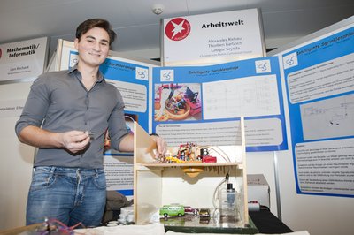 Als die Projekte am Mittwoch, 22. März, der Öffentlichkeit vorgestellt wurden, war zunächst nur einer von den drei Lokalmatadoren anwesend. Während Gregor Seyeda den Besuchern Rede und Antwort zum Projekt „Intelligente Sprinkleranlage“ stand, beschäftigten sich seine beiden Partner Alexander Riebau und Thorben Bartzsch mit ihren Abiturklausuren. Als dann am späten Nachmittag die Preise in den insgesamt acht Kategorien verliehen wurden, war das Trio wieder komplett und feierte den Erfolg.