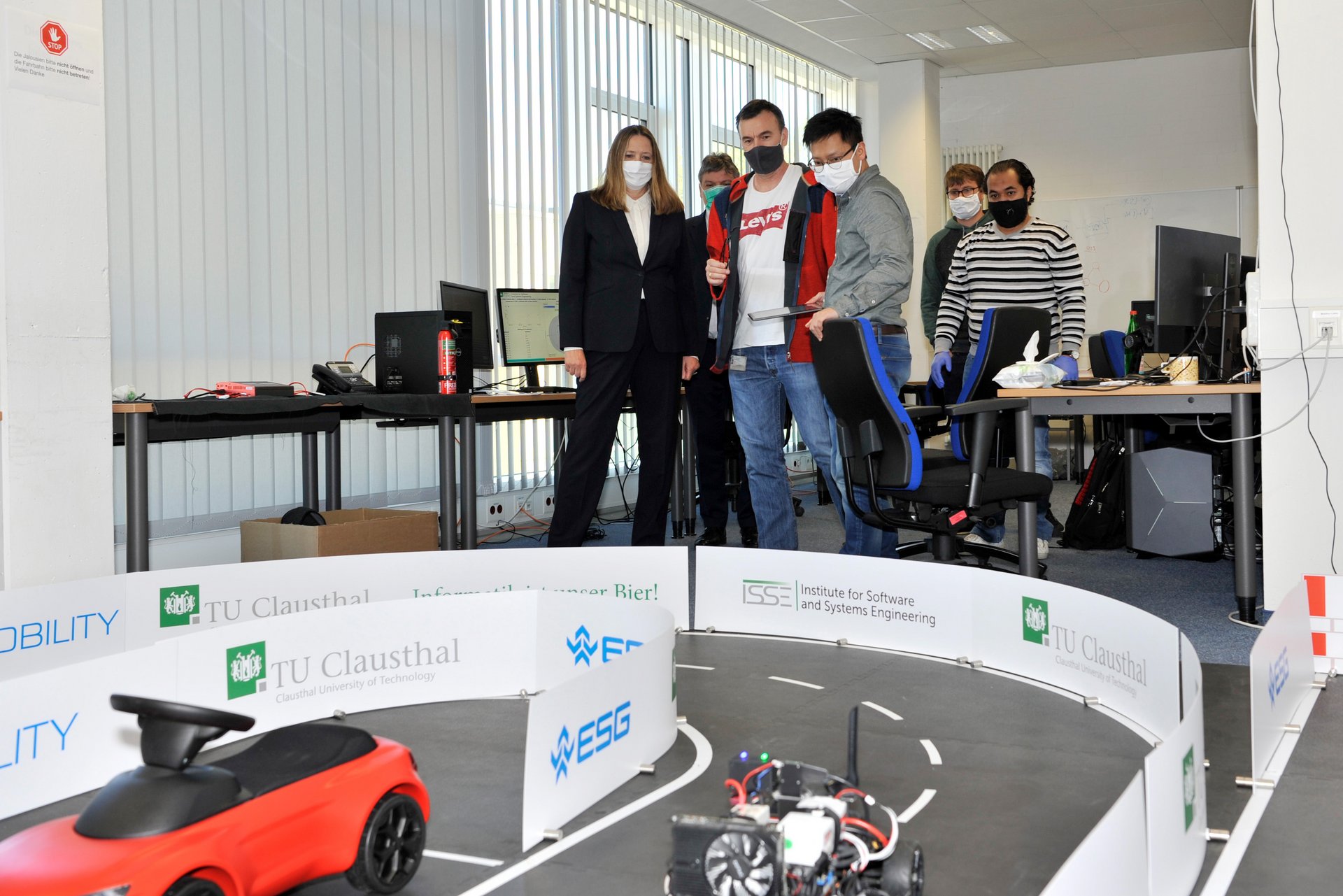 Das Thema Forschung an der TU Clausthal vertiefte die Landtagspräsidentin im Anschluss bei zwei Institutsbesichtigungen. Im Institute for Software and Systems Engineering informierte Professor Andreas Rausch den Gast aus Hannover über das „Center for Digital Technologies – Innovation durch nachhaltige industrielle Prozesse und Dienste“. Zusammen mit Studierenden stellte er etwa Projekte zu unkompliziertem Entsorgen von Elektronikschrott, zum autonomen Fahren und zu Künstlicher Intelligenz (KI) vor.