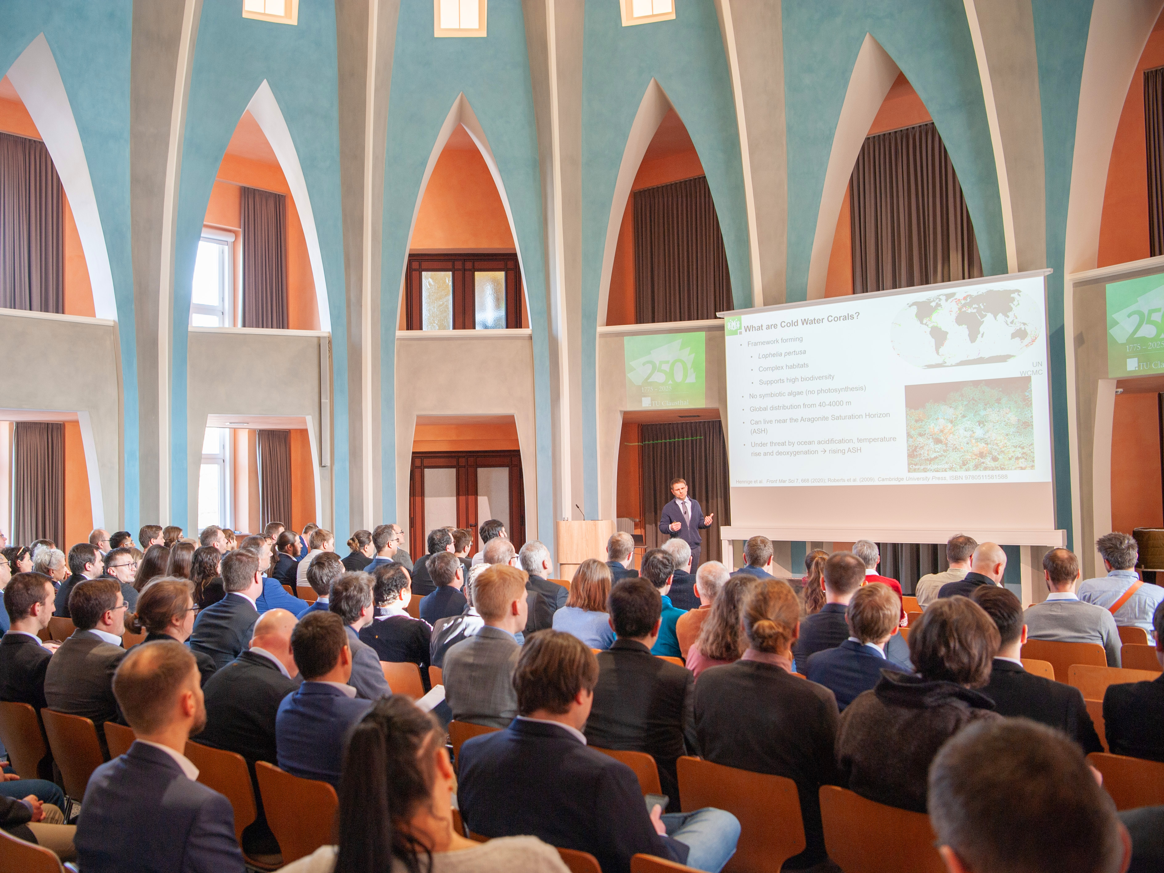 Dr. Sebastian Levin, Institut für Werkstoffkunde und Werkstofftechnik (TU Clausthal), hielt einen Leitvortrag über die Degradation, also den Abbau von Körper und Zellstrukturen, der Skelette von Kaltwasserkorallen. Die Folge der sich ändernden Bedingungen in den Weltmeeren sind schlechtere mechanisch-technologische Eigenschaften, die durch strukturelle Instabilität zu einer Gefährdung von Korallenhabitaten führen. Da ein gesundes Korallenskelett die Festigkeit von Beton besitzt, besteht ein hohes Potential, derartige Werkstoffe auch als nachhaltigen Konstruktionswerkstoff einzusetzen und über Bioprinting zu erzeugen.
