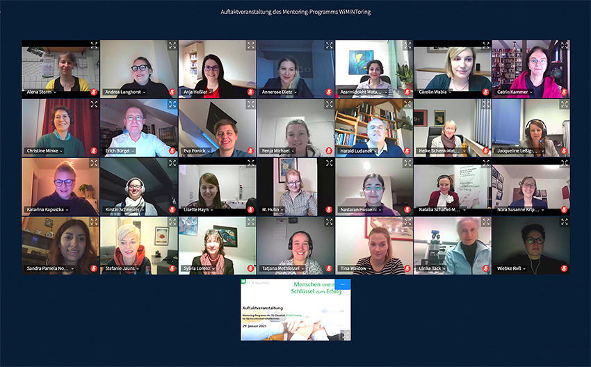 Per Videokonferenz sind die einzelnen Mentoring-Tandems für den zweiten Durchlauf des Programms WiMINToring bekanntgegeben worden. Insgesamt sind zehn neue Mentee-Mentor/innen-Paare gebildet worden, die sich mit dem Organisationsteam und den Trainerinnen zum digitalen Gruppenbild (siehe unten) versammelten. Fotos: Kaiser, TUC