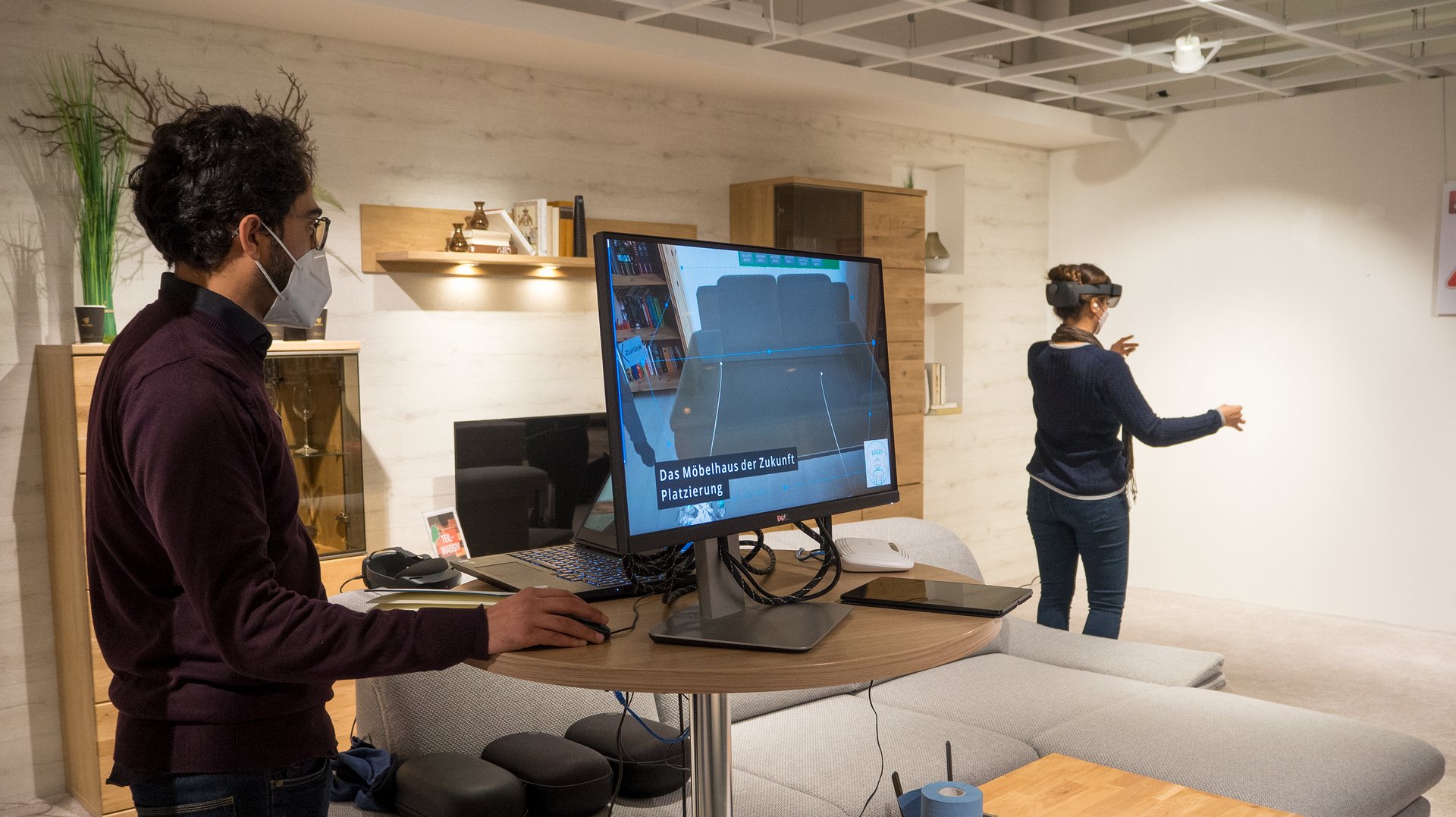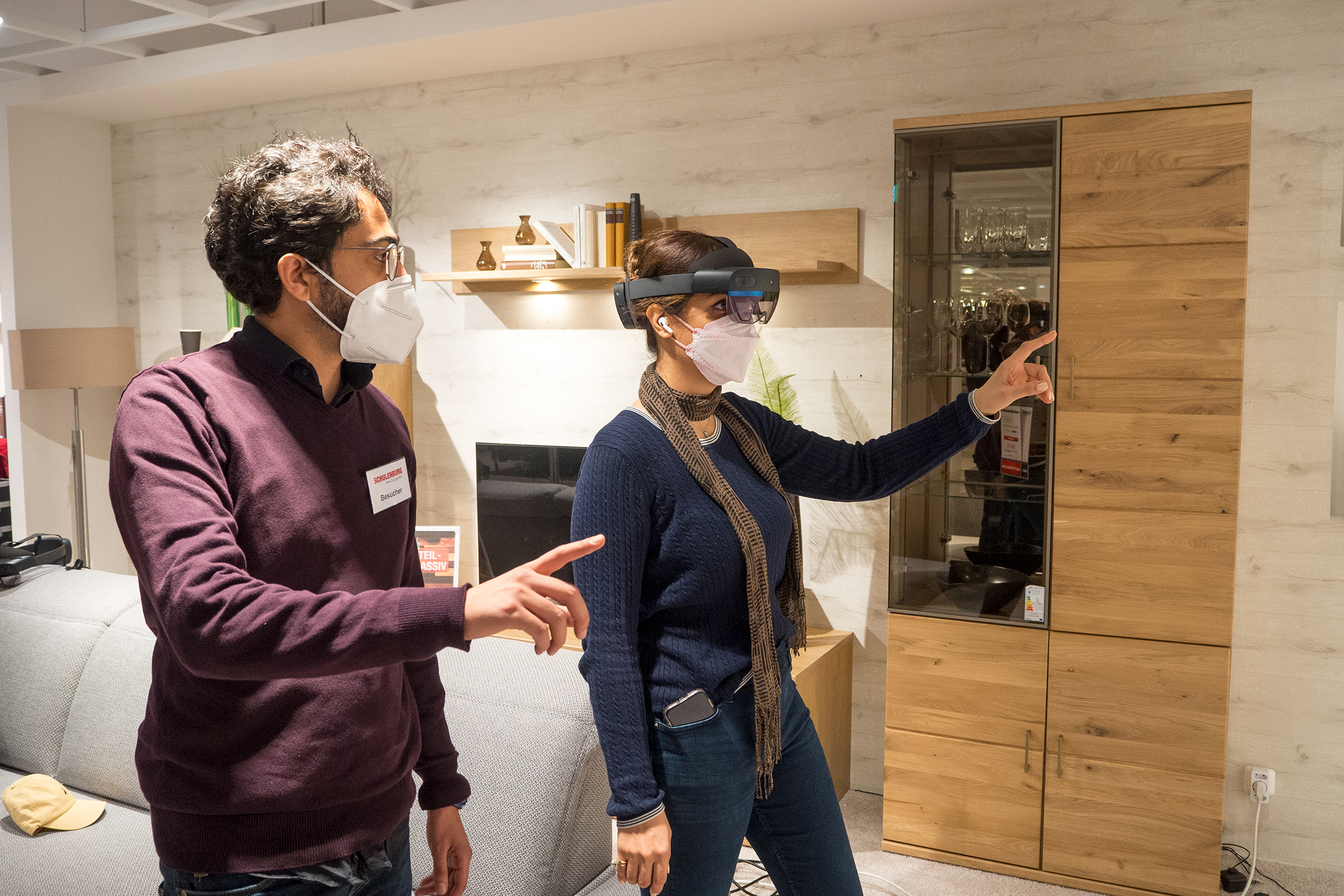 Mithilfe einer Augmented-Reality Brille, die die Umgebung scannt, werden virtuelle Möbelstücke in den Raum projiziert. Dabei kann der Nutzende mittels seiner Finger das Objekt im Raum verschieben, drehen und anpassen. So können beispielsweise die Farbe, der Stoff oder die Füße eines Sofas individuell verändert werden. Dabei besteht die Möglichkeit von einem Verkäufer oder einer Verkäuferin virtuell beraten zu werden. Über einen Computer kann die Person dabei sehen, welche Anpassungen die Kundin oder der Kunde gerade vornimmt und bei Bedarf auch selbst Hand anlegen. Dabei hört man nicht nur die Stimme, sondern sieht sogar einen Berater-Avatar. Die Möglichkeiten gehen aber auch über die Wahl des Sofas hinaus. Von der Küche bis zum Kinderzimmer soll jeder Raum über digitale Technologien eingerichtet werden können.