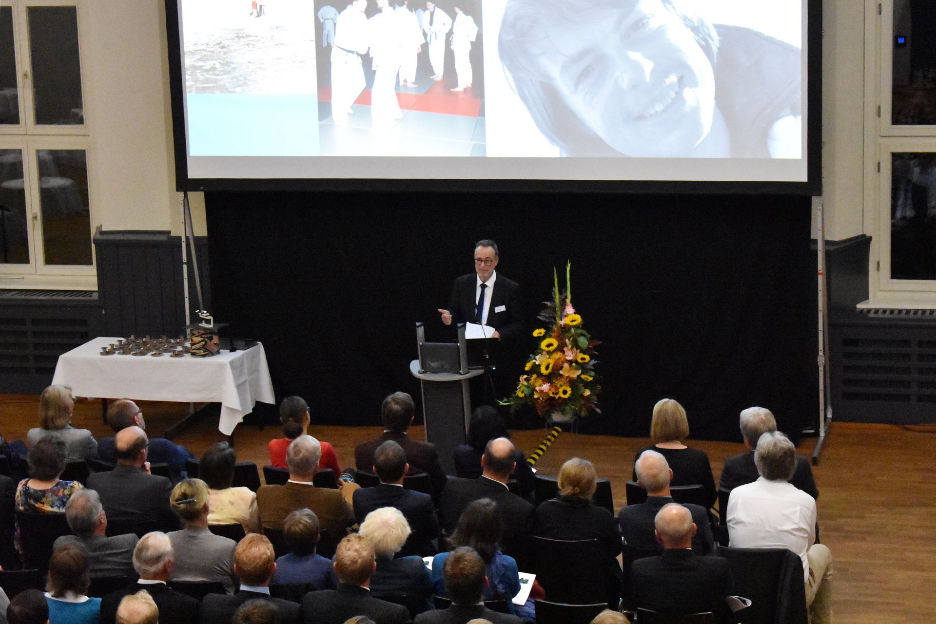 Begrüßt von Universitätspräsident Professor Joachim Schachtner, gehörte die Bühne danach den Promotionsjubilaren. Den Keynote-Vortrag hielt Dr. Joachim Hug, der 1994 am Lehrstuhl von Professor Harald Zenner promoviert worden war, zum Thema „Mein Weg nach der Promotion in die Selbstständigkeit“. Noch während der Dissertationsphase hatte Hug mit seinem Doktorvater in Clausthal-Zellerfeld die Prüftechnik-Firma SincoTec gegründet. 1995 erhielt er den Technologie-Transferpreis der IHK Braunschweig. Heute hat sich aus diesen Anfängen eine weltweit agierende Unternehmensgruppe mit mehr als 100 Mitarbeitern entwickelt.