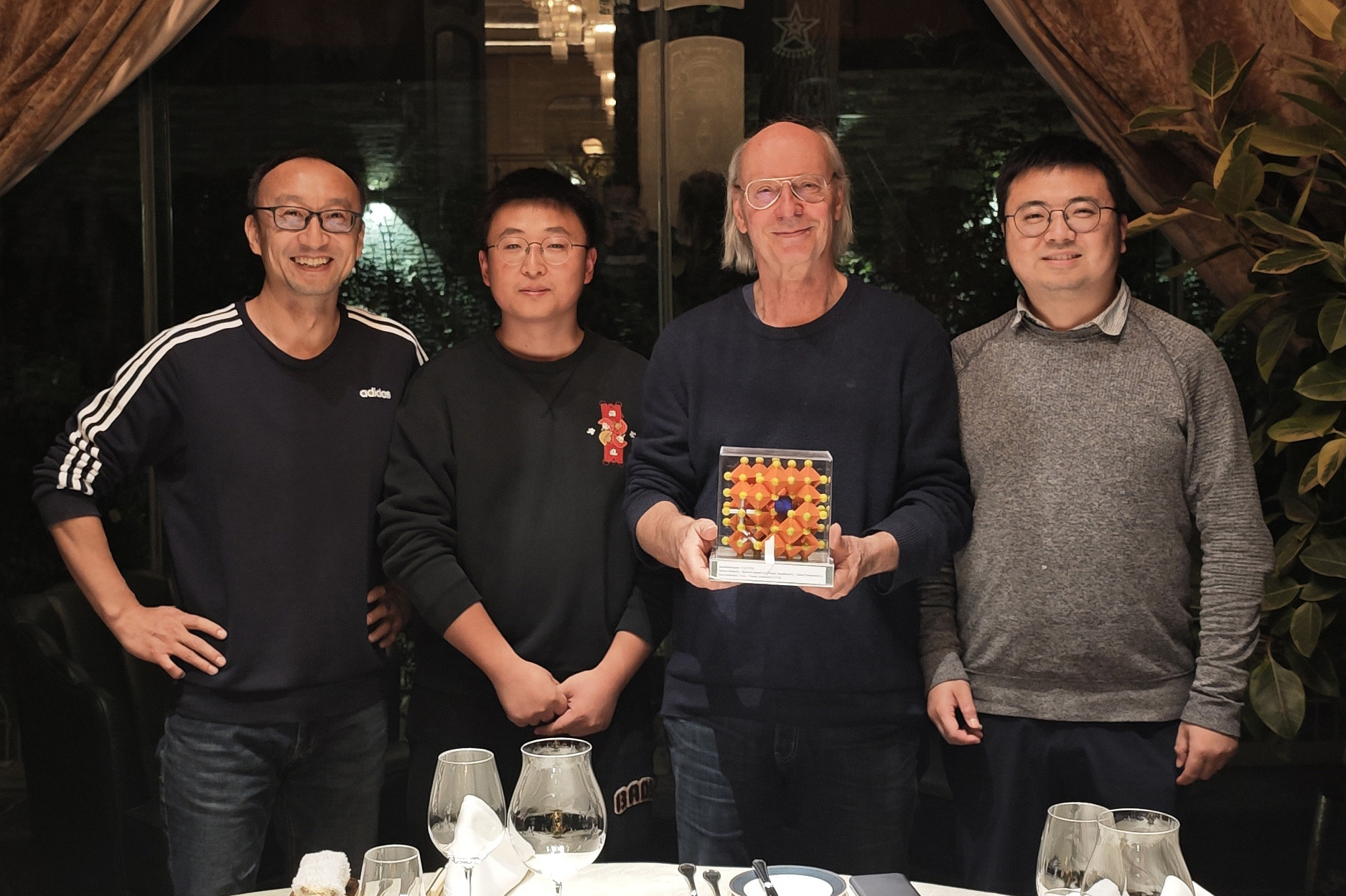 Feier aus Anlass des neuen Minerals Berndlehmannit im Restaurant „Flo Maison“ in Peking: Prof. Bernd Lehmann mit einem kristallographischen Modell des neuen Minerals zusammen mit Doktorand Xuerui Fu und den Ex-Clausthalern Prof. Lingang Xu (links) sowie Prof. Wei Jian (rechts), alle von der University of Geosciences Beijing. Foto: privat