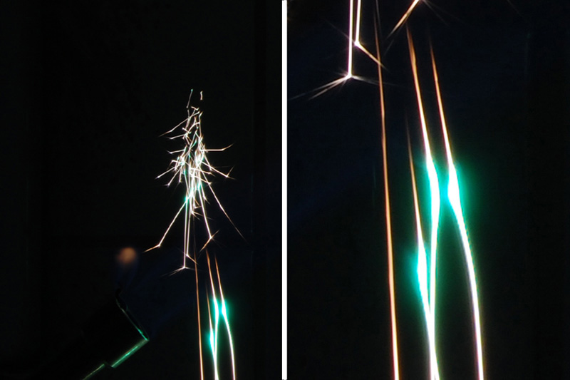 Auf der Suche nach langen, ungewöhnlich gefärbten Funken und unter Berücksichtigung aller theoretischen Grundlagen blieb ein Element übrig, das bisher noch nicht untersucht wurde: das Metall Erbium. „Der Einsatz von Erbium ergab schließlich – auch zu unserer eigenen Überraschung – Funken, die zwei Mal die Farbe wechseln“, so Hübner. Dies lasse sich mit den theoretischen Modellen im Nachhinein gut erklären, da ein Wechsel zwischen einem glühenden Partikel und einer gasförmig verbrennenden Phase stattfindet. Letztere ist nur bei sehr hohen Temperaturen möglich und daher von kurzer Dauer. Praktisch bilden damit die beschriebenen Erbium-Funken eine Möglichkeit für tatsächlich lange sichtbare, weit fliegende Funken mit einer intensiv grell-grün gefärbten Phase. Die unterschiedlichen Phasen konnten mit Hilfe von Messungen des Fraunhofer HHI charakterisiert werden.