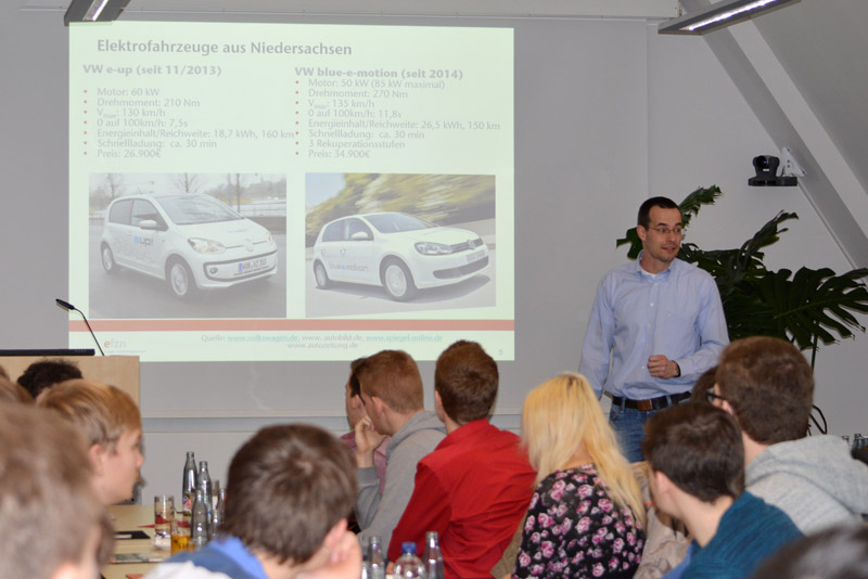 Dr. Raoul Heyne, Wissenschaftler am EFZN und am Clausthaler Institut für Elektrische Energietechnik und Energiesysteme, brachte es auf den Punkt: „Fragen Sie, was immer Ihnen in den Kopf kommt. Wenn Sie diese Frage haben, dann bestimmt auch noch jemand.“ Und die 40 Jungen und Mädchen vom Werner-von-Siemens Gymnasium Bad Harzburg und dem Göttinger Max-Planck-Gymnasium ließen sich nicht lange bitten, schließlich denkt man in der 11. Klasse bereits an den Führerschein und das erste Auto. Und da traf der Vortrag von Heyne zum Thema Elektromobilität direkt ins Schwarze. Neben einigen Fabrikaten, die bereits auf dem Markt erhältlich sind, stellte er auch die momentanen Vor- und Nachteile der Elektrofahrzeuge dar.