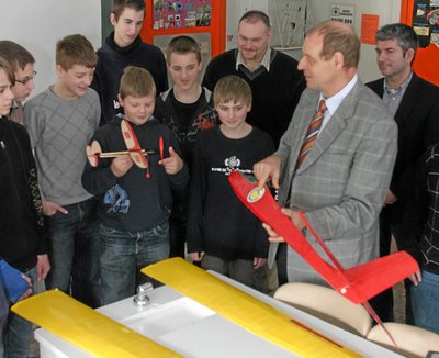Nach der Theorie werden die „Nachwuchsphysiker“ sichtlich nervös. Jetzt wollen sie es selbst ausprobieren. Mit ihren Lehrern geht es deshalb in die Werkstatt der Schule, um das Gelernte in die Praxis umzusetzen. Genau das ist auch der Sinn des Kurses: „Wir wollen die Jugend für wissenschaftlich-technisches Arbeiten begeistern“, begründet Balck das Engagement der Harzer Universität. „Es ist wichtig die Schüler zu motivieren“, fügt Torsten Röpke von der Werbegemeinschaft Oker hinzu, die dieses Projekt anregte. Auf dem Stundenplan der jungen „Wissenschaftler“ steht nun einmal pro Woche, verschiedene Flugmodelle zu bauen, die letztlich in einem Wettbewerb gegeneinander antreten werden.