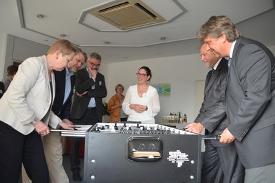 Zum Abschluss des offiziellen Teils der Veranstaltung überreichten die Präsidenten der vier südniedersächsischen Hochschulen der SNIC-Geschäftsstelle noch ein besonderes Präsent: Ein Kicker soll nicht nur den Teamgeist fördern, sondern Mitarbeitern und Gründerteams in den Pausen helfen, neue Inspiration zu finden.