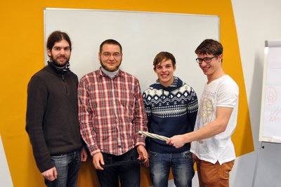 Während einer kleinen Preisverleihung erhielten Simon Schmusch, Robert Heitmann, Christian Stegh und Kevin Menger von Professor Armin Lohrengel die Auszeichnung überreicht. Drei weitere Studierende - Martin Marquardt, Konstantin Rempel und Eugen Walter, die derzeit im Ausland weilen - bekommen den Preis nachgereicht. Dazu erhalten alle Vorlesungsteilnehmer ein Taschenbuch zur Geschichte des Drahtseils und eine Biographie über den Apple-Mitgründer Steve Jobs.