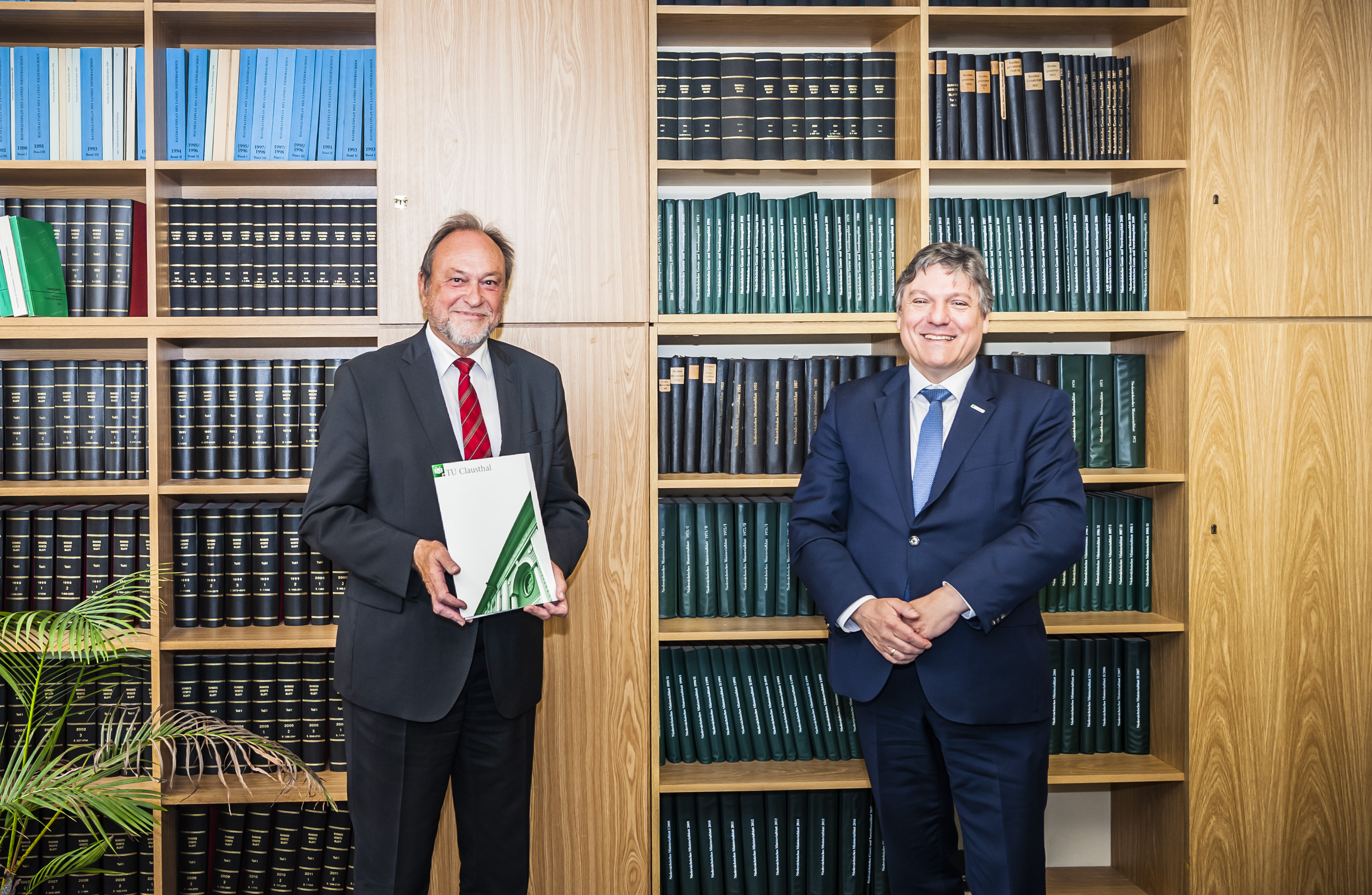 Universitätspräsident Professor Joachim Schachtner überreichte seinem Vorgänger im Amt die Dankesurkunde. Seit 1993 war Thomas Hanschke als Universitätsprofessor für Stochastische Modelle in den Ingenieurwissenschaften am Institut für Mathematik der TU Clausthal tätig gewesen. Für seine Zeit als TU-Präsident (2008 bis 2018) war er im Oktober 2018 von Wissenschaftsminister Björn Thümler vor 400 Gästen in der Aula Academica gewürdigt und verabschiedet worden.