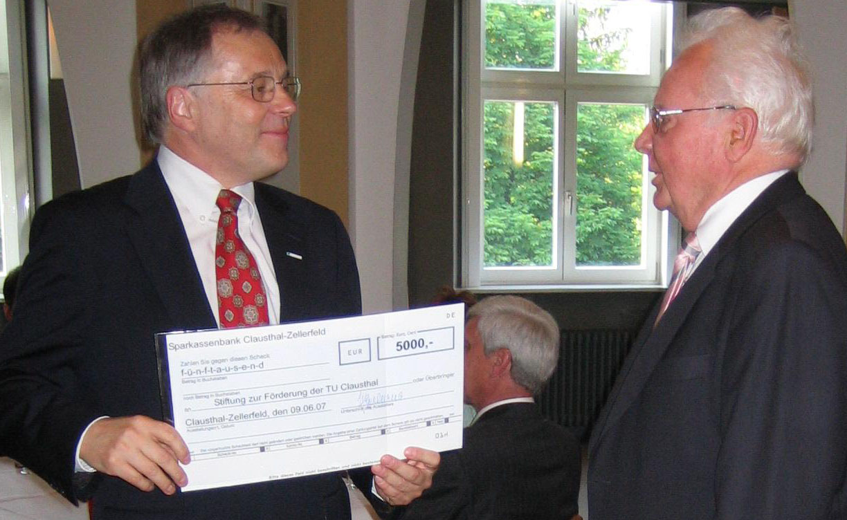 CLAUSTHAL. Einen Scheck in Höhe von 5.000 Euro hat Professor Jörn Holland, der das heutige Institut für Tribologie und Energiewandlungsmaschinen (ITR) von 1972 bis 2000 geleitet hat, für die „Stiftung zur Förderung der TU Clausthal“ an Uni-Präsident Professor Edmund Brandt überreicht. Der feierliche Akt fand im Rahmen eines Kolloquiums am ITR statt. Die Zusammenkunft von rund 90 Wissenschaftlern, darunter zahlreiche Absolventen des Instituts, war zu Ehren von Professor Holland ausgerichtet worden, der im April seinen 75. Geburtstag gefeiert hatte.