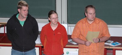 Die Bezirksgruppe Harz ist die Vertretung des VDI im Westharz. An der TU Clausthal angesiedelt, kümmert sie sich um die Förderung der Ingenieurstudierenden über das Studium hinaus. Hierzu fördert sie durch Exkursionen den Blick über den Tellerrand der Hochschule und vergibt jedes Semester Preise für die besten Vorträge im Maschinentechnischen Gemeinschaftsseminar. Der scheidende Leiter der Bezirksgruppe, Professor Dietz, ehrte als letzte Amtshandlung die Beiträge zum Thema „Axialer Öldurchfluss im Wälzlager“ von Nadine Nagler, „Hydraulische Rettungsgeräte“ von Patrick Brosch und „Die Biogasanlage“ von Jan Kellner. Neben einer Urkunde erhielten die Preisträger eine Studienunterstützung in Höhe von 125 Euro.