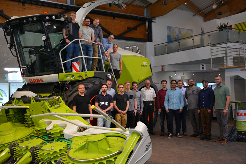 Begonnen hatte das Praktikum, das am Clausthaler Institut für Maschinelle Anlagentechnik und Betriebsfestigkeit von Dr. Michael Wächter und Lukas Masendorf durchgeführt wird, mit einer Mischung aus Vorlesung, Gruppenarbeit und Selbststudium. Beendet wurde die Veranstaltung Anfang Juli mit einer Exkursion zum Hersteller und der Bekanntgabe der Ergebnisse. Die 16-köpfige Gruppe wurde im Hauptsitz in Harsewinkel im Techno-Park des Unternehmens, einer Art Show-Room, von Susanne Schwartbeck vom Corporate HR Marketing empfangen. Hier konnten die Clausthaler Studierenden gleich zu Beginn des Besuchs einen Eindruck von den – allein schon durch deren Größe – imposanten Landmaschinen gewinnen. Besonders beeindruckte der Feldhäcksler „Jaguar”, der mit dem montierten „Maisgebiss” seinem Namen alle Ehre macht.