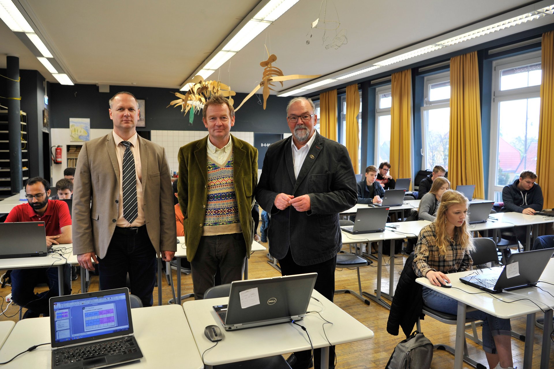 Im Ratsgymnasium Goslar testete die Arbeitsgruppe von TU-Professor Roland Menges (Institut für Wirtschaftswissenschaft) ihren Forschungsansatz im Bereich Gamification. Für Schulleiter Hans-Peter Dreß (Bild unten, rechts) und dessen Stellvertreter Michael Kwasniok (links) könnte die Zusammenarbeit der Auftakt für weitere Projekte mit der Uni sein. Fotos: Ernst