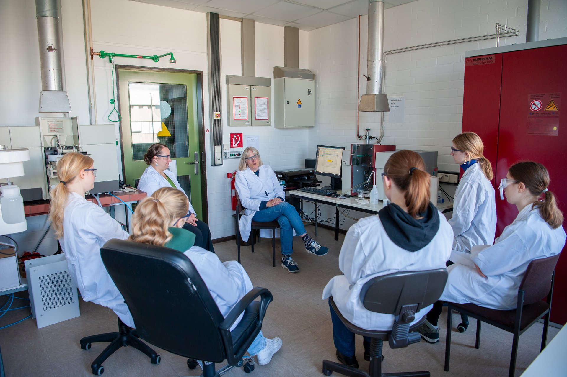 Die Schülerinnen erhielten Einblicke in verschiedene Institute und Einrichtungen der TU Clausthal. Unter anderem führte die Gruppe am Institut für Anorganische und Analytische Chemie Versuche durch. Beispielsweise untersuchten sie unter Anleitung von Petra Lassen Proben von Mineral- und Leitungswasser sowie Kräuter- und Pfefferminztee mittels eines Flammen-Atomabsorptionsspektrometers auf ihren Zinkgehalt.