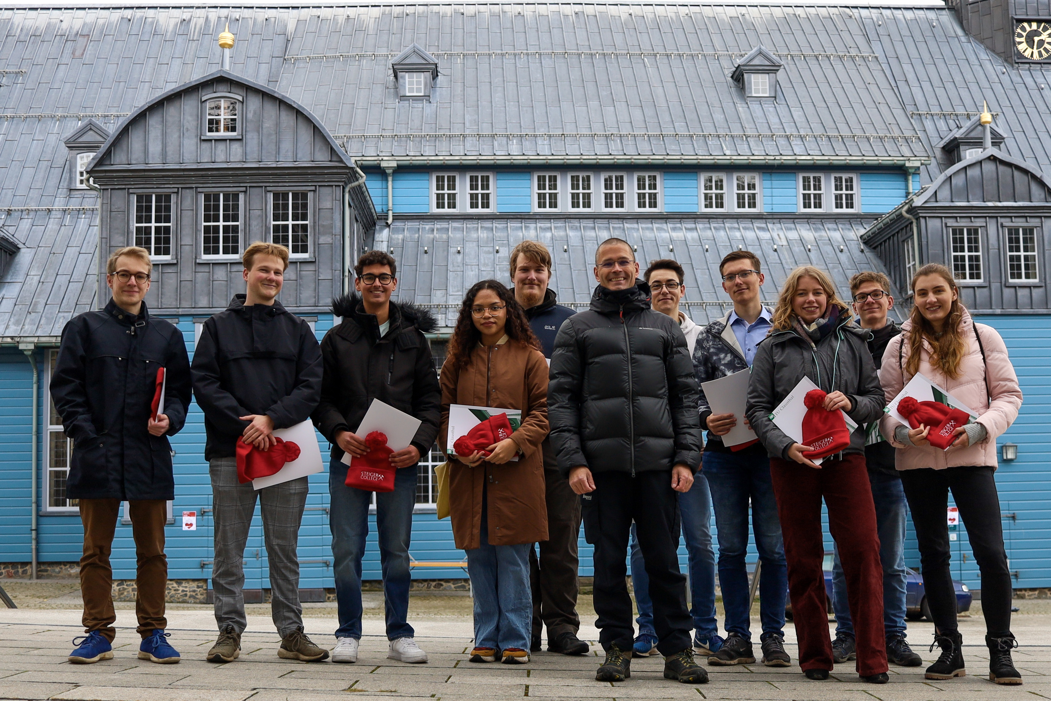An der Feier vor dem Hauptgebäude der TU Clausthal haben rund 30 der erfolgreichen Absolventinnen und Absolventen der vergangenen zwei Jahre teilgenommen. Sie bekamen ihr Steiger-College-Zertifikat vom Vizepräsidenten für Studium und Lehre, Professor Christian Bohn, überreicht.