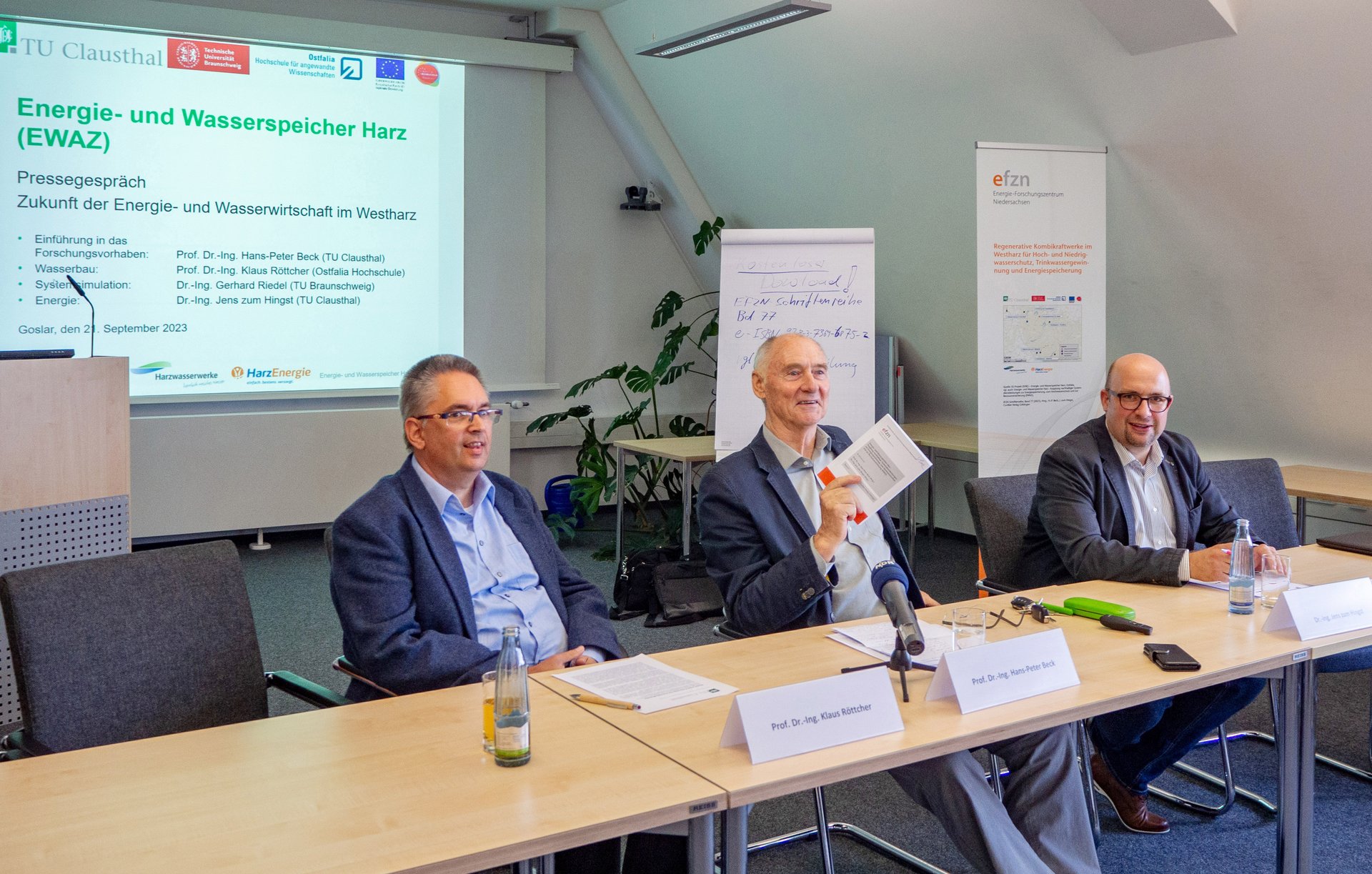 Im Pressegespräch führte Projektleiter Prof. Beck in das Forschungsvorhaben ein. Es folgten Kurzvorstellungen zu den Themen Systemsimulation, Wasserbau (durch Prof. Röttcher, Ostfalia Hochschule) und Energie (durch Dr. zum Hingst, TU Clausthal). Nach Vorlage des Abschlussberichtes seien nun die Politik und in der Folge die Wirtschaft am Zug, um die Projektergebnisse in eine mögliche Umsetzung zu transformieren, betonte Prof. Beck.