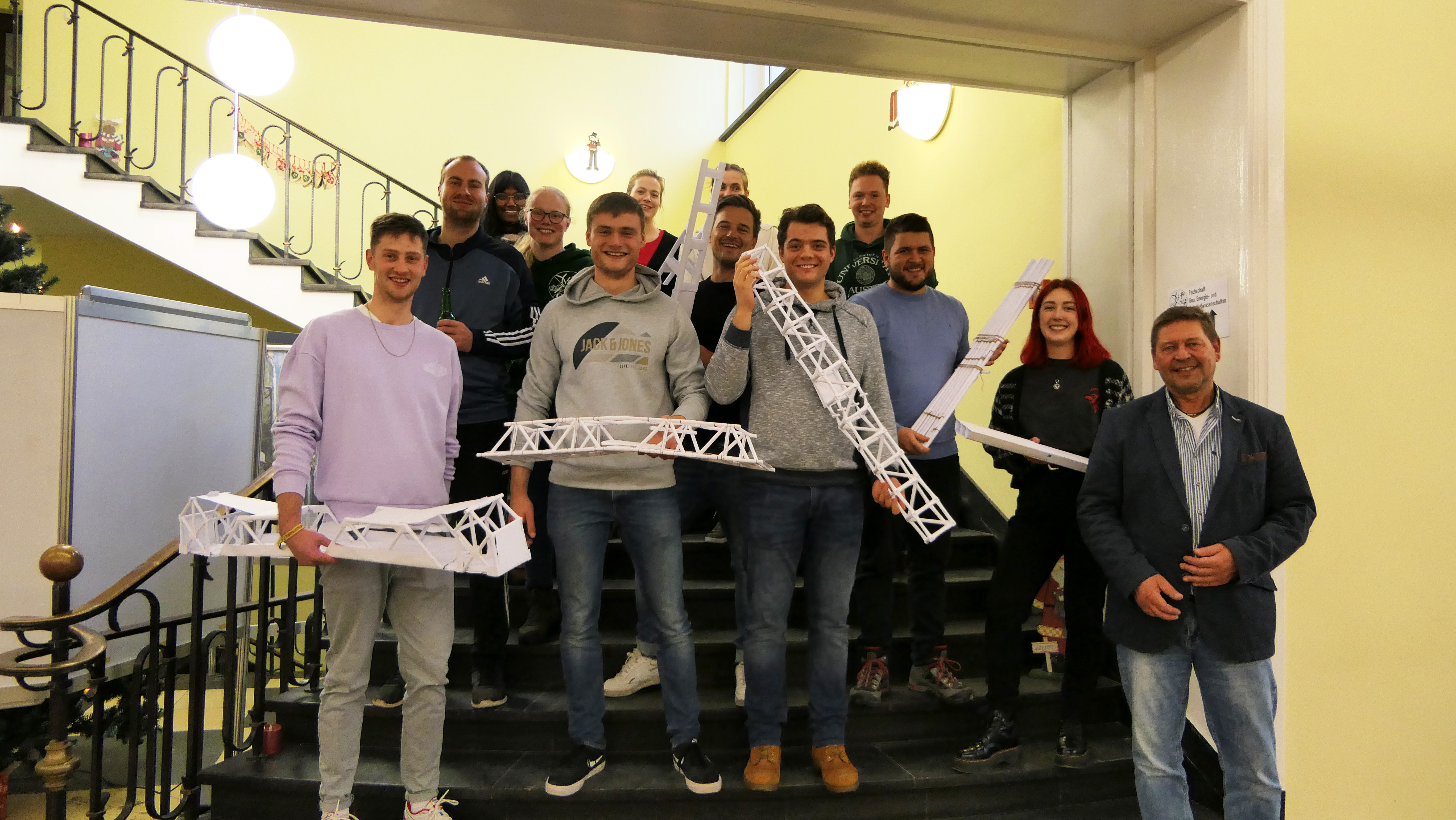 Kurz vor der Weihnachtspause galt es, eine klapp-, ausfahr- oder zerlegbare Brücke aus Papier mit minimalem Eigengewicht zu entwickeln. Das Modell sollte einen Abstand von 80 Zentimetern überbrücken und dabei ein Gewicht von mindestens 500 Gramm tragen können. Die besondere Herausforderung: Die Brücke durfte nicht aus einem Stück zu Hause gebaut werden, sondern musste während des Wettbewerbs innerhalb von zwei Minuten zusammengesetzt werden. Die Größe der Einzelteile war dabei auf eine Länge von 45 Zentimetern begrenzt und die Auflagefläche der Brücke durfte die Größe eines querliegenden DIN A4-Blattes nicht überschreiten.