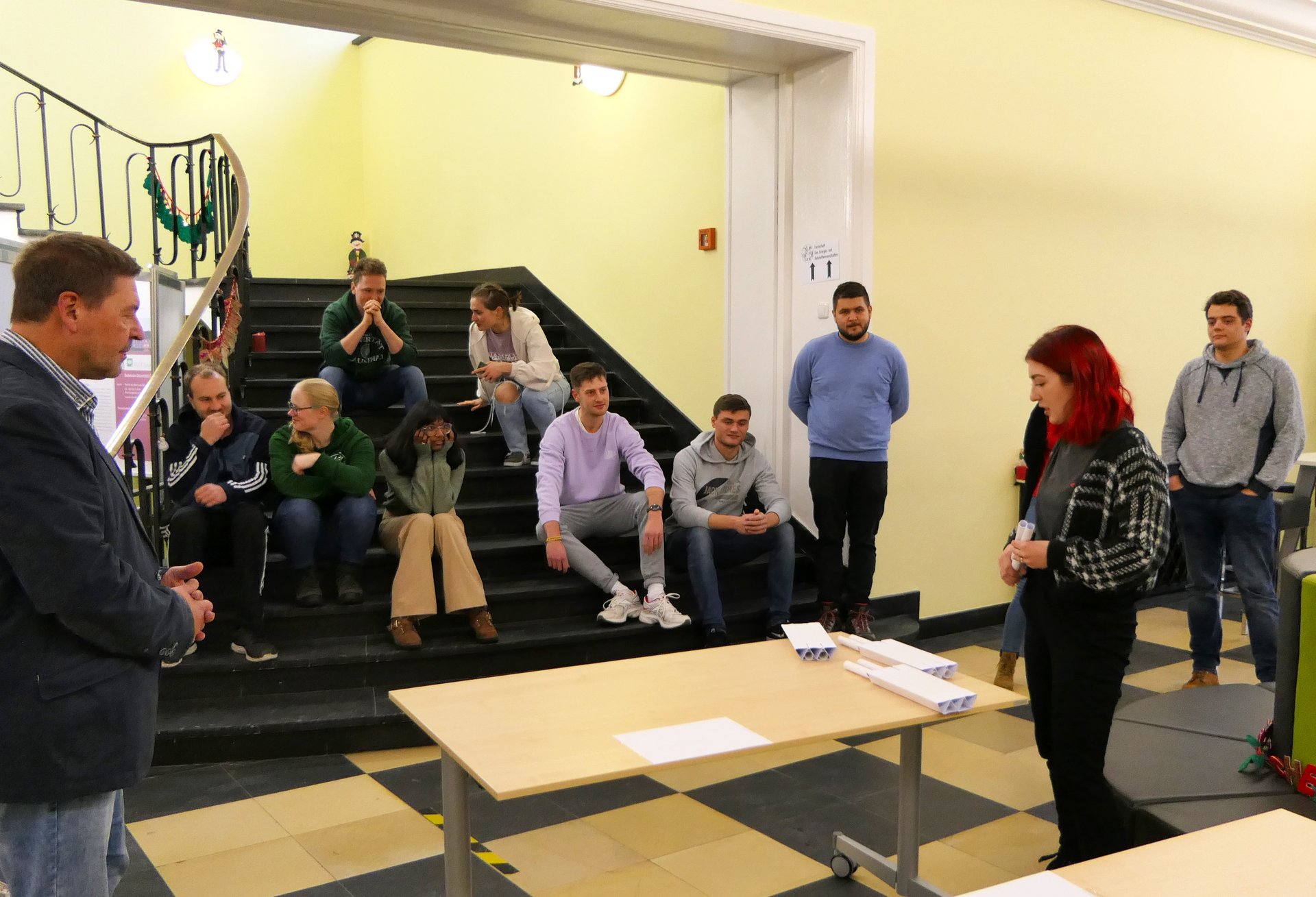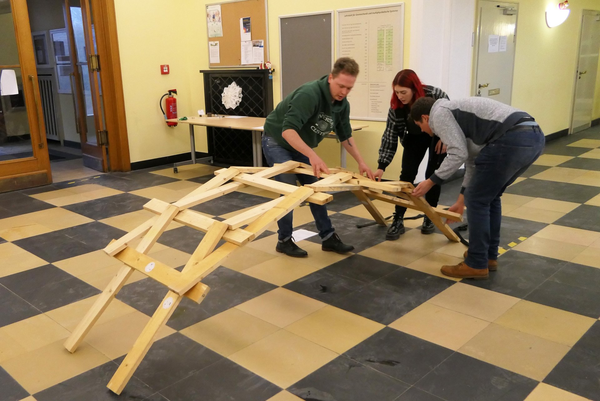 Als Zusatzaufgabe traten die Teilnehmenden in zwei Teams beim Bau einer Leonardo-da-Vinci-Brücke gegeneinander an. Aus 18 Holzlatten legten sie mehrmals den Buchstaben „H“ zusammen und verkeilten diese, sodass sich eine Rundbogenbrücke ergab. Das Siegerteam hatte die Bogenbrücke innerhalb weniger Minuten fertiggestellt und bestand den Belastungstest mit Bravour: Ein Studierender wagte sich sicher über die Konstruktion.
