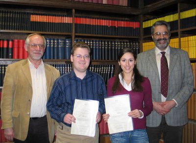Clausthal-Zellerfeld. In vier Semestern bis zum Chemie-Vordiplom und dies mit einem glatten „Sehr Gut“ auf dem Zeugnis - das erreichten im Prüfungszeitraum 2007 die Clausthaler Studierenden Nadia Aoun und Robert Scherf. Diese herausragenden Leistungen würdigte Professor Dr. Arnold Adam, Vorsitzender im Ortsverband Harz der Gesellschaft Deutscher Chemiker (GDCh), im Rahmen der GDCh-Vortragsreihe im Historischen Hörsaal des Institutes für Anorganische und Analytische Chemie.