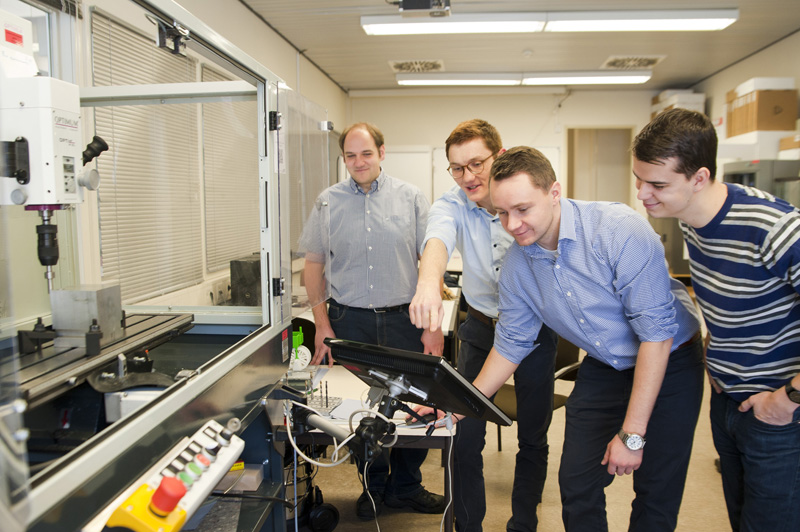 Julian Dreblow steht mit Mirco Fuhrmann und Timo Roth in der mechanischen Werkstatt des Instituts für Maschinenwesen. Die drei Clausthaler Maschinenbau-Studenten richten einen 3D-Drucker ein, um einen Würfel zu fertigen, wie man ihn für Brettspiele nutzen kann. „In der Studierendenwerkstatt können wir kreativ werden oder praktische Dinge nachkonstruieren“, sagt Fuhrmann. Dreblow, der sich auch als Ansprechpartner für Kommilitonen in das Projekt einbringt, berichtet: „Neben zwei 3D-Druckern steht eine Fräse zur Verfügung. Konstruiert wurden bisher beispielsweise Bauteile für einen Oldtimertraktor, Komponenten für einen Lautsprecher oder Ersatzteile für einen Dimmer bzw. eine Gardinenhalterung.“ Dass man die Produkte nicht bloß auf dem Bildschirm betrachten, sondern nach dem Druck in der Hand halten und sehen könne, dass sie funktionieren, sei sehr motivierend, ergänzt Roth.