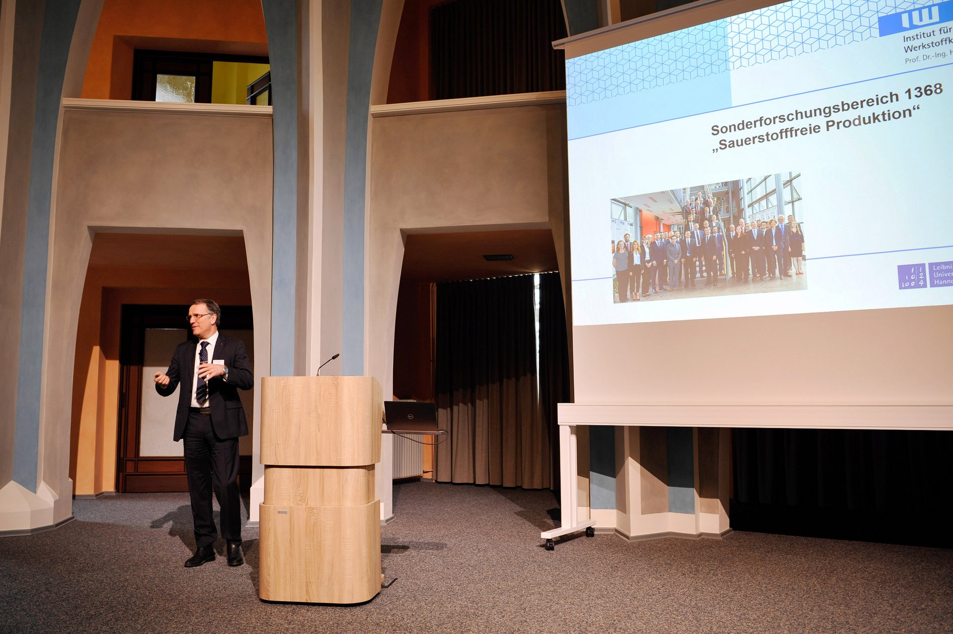 Insbesondere die drei Leitvorträge zogen das Interesse der Gäste auf sich. Der erste bot eine ganzheitliche Darstellung des Sonderforschungsbereiches 1368 „Sauerstofffreie Produktion“, ein Kooperationsprojekt zwischen der Leibniz Universität Hannover (LUH) und der TU Clausthal. Prof. Hans-Jürgen Maier (LUH), der Sprecher des SFB, stellte die positiven Effekte einer sauerstofffreien Produktion in punkto Wärmeleitfähigkeit, Haftzugfestigkeit und Reaktionsschichtverschleiß vor. Durch verbesserte Bauteileigenschaften infolge neuer Prozesse und Produkte ließen sich Energie- und Ressourceneffizienz, CO2-Einsparung und Umweltschonung spürbar vorantreiben.