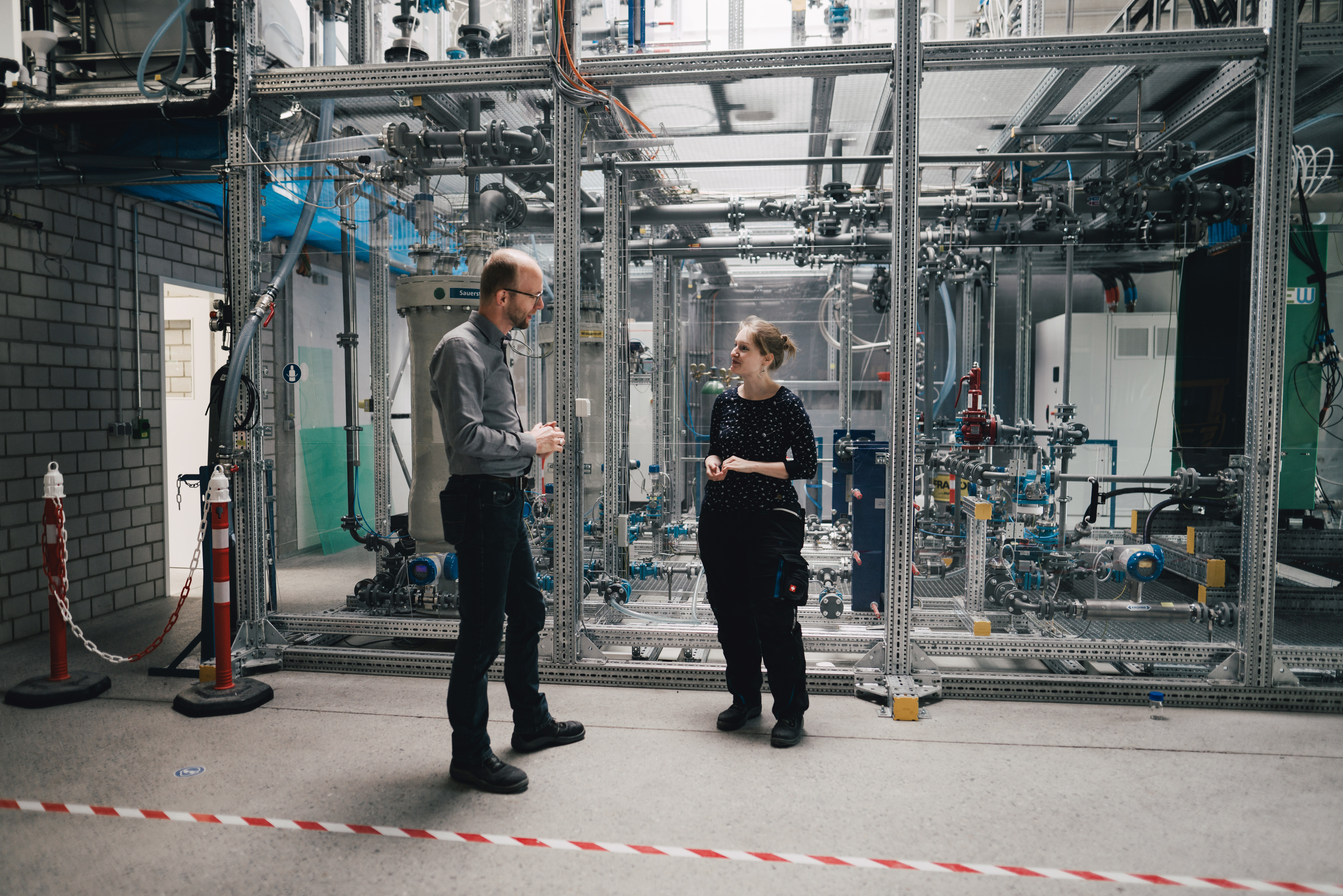 Dr. Maik Becker und Dr. Stina Bauer im Fachgespräch vor dem neuen Elektrolyse-Testfeld am Forschungszentrum Energiespeichertechnologien. Das Thema Wasserelektrolyseforschung stellen die Forschenden der TU Clausthal auf der Hannover Messe vor. Auch Staatssekretär Prof. Joachim Schachtner, ehemaliger Präsident der TU Clausthal, hat den Stand besucht (siehe Bild unten). Fotos: Kreutzmann, Zielinski