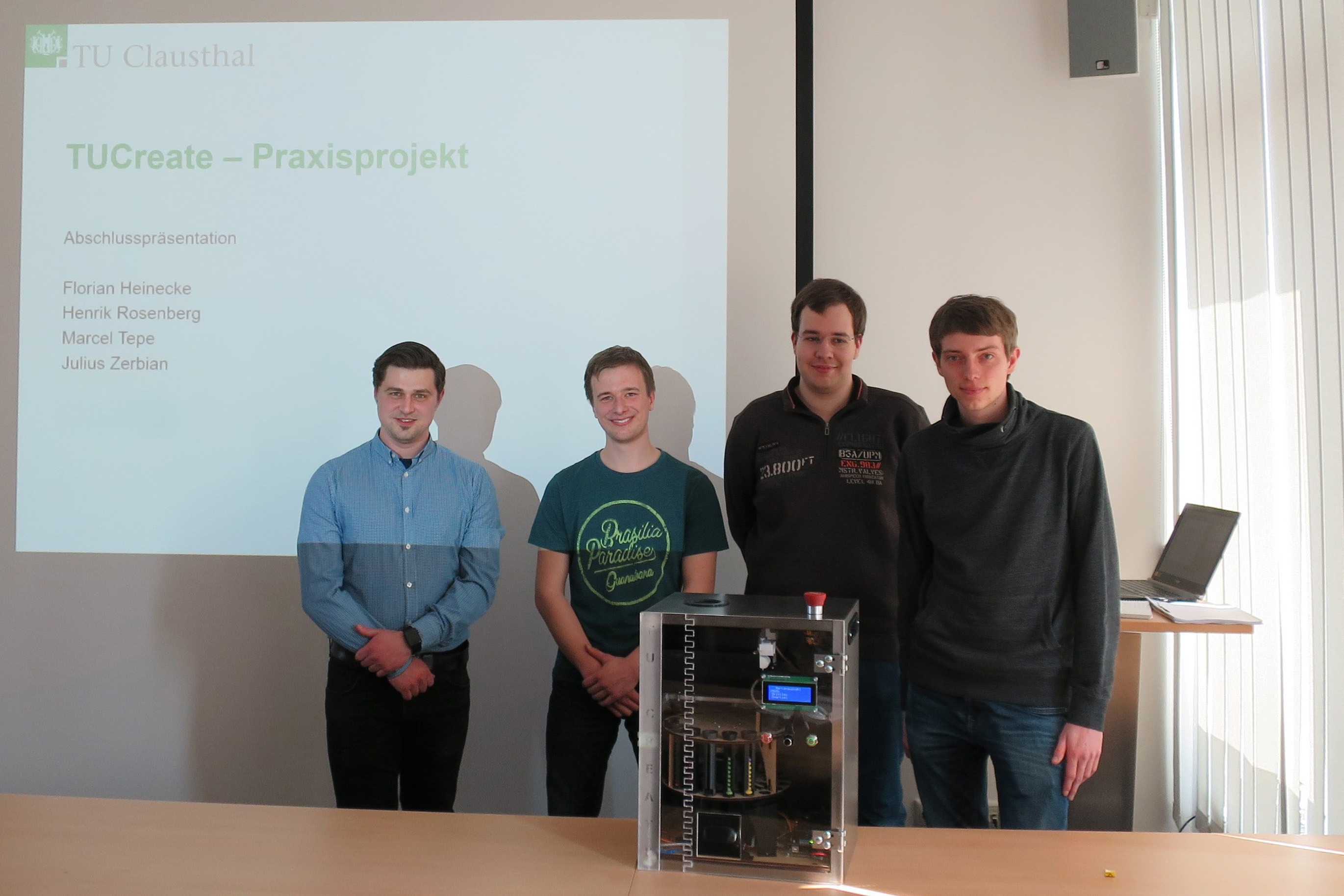 Während die Studierenden im Laufe des Projektes weitgehend eigenständig an ihrem System tüfteln und entwickelt konnten, war im CZM die gemeinsame, öffentliche Präsentation gefragt. Zunächst erläuterten sie Entwurfsentscheidungen und Vorgehensweisen, um danach das entwickelte Gerät in den Praxiseinsatz zu überführen. Gäste und Studierende, die sich für eine künftige Projektteilnahme interessieren, sahen dem Automaten dabei zu, wie Kaudragees, kandierte Erdnüsse und Schokolinsen nach Farbe sortiert und auf Wunsch auch so wieder ausgegeben werden konnten. Auch künftig kann das Sortiergerät besichtigt werden: Nach letzten Modifikationen wird es im TUCreate-Raum am Institut für Maschinenwesen zu finden sein. Die Studierenden zeigten sich zufrieden mit ihrer Leistung. Und auch Dr.-Ing. Andreas Reinhardt vom Institut für Informatik bekräftigte: „Dieses durchweg erfolgreiche Projekt zeigt sehr schön auf, wie viel mehr man durch die interdisziplinäre Zusammenarbeit erreichen kann. Wir hoffen, die Studierenden damit zumindest ein Stück weit auf die Anforderungen in ihren künftigen Berufen vorbereitet zu haben.“