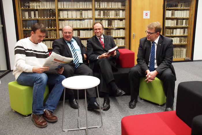 „Vielfältige Informationsquelle, facettenreiche Arbeitsstätte, geistiger Mittelpunkt und kommunikativer Treffpunkt - all das muss eine moderne Bibliothek bieten“, so Professor Andreas Rausch, TU-Vizepräsident für Informationsmanagement und Infrastruktur. Um den veränderten Bedürfnissen gerecht zu werden, sei in den vergangenen Jahren viel passiert. Jüngstes Kind im Erneuerungsprogramm der Bibliothek, die pro Jahr mehr als 260.000 Nutzer zählt, ist ein im Oktober fertiggestellter moderner Seminar- und Besprechungsraum. Sitzungen, Schulungen, Erstsemestereinführungen und Seminare können in den renovierten vier Wänden durchgeführt werden. Viel Gefallen fanden die Präsidiumsmitglieder auf ihrem Rundgang auch im Lounge-Bereich, der zwischen intensiven Lernphasen zum stillen Relaxen einlädt. „Da möchte man noch einmal Student sein“, so der Tenor der Präsidiumsvertreter.