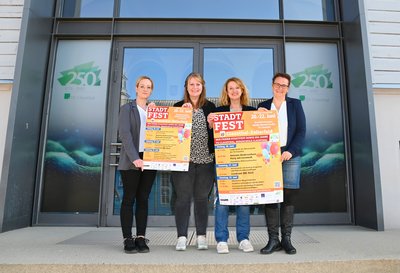 Präsentieren das Plakat zum gemeinsamen Festwochenende vom 20. bis 22. Juni (von links): Inga Pätzolt (Stadt Clausthal-Zellerfeld), Katharina Dundler (Oberharz Tourismus), Bürgermeisterin Petra Emmerich-Kopatsch und Universitätspräsidentin Dr.-Ing. Sylvia Schattauer. An der TU Clausthal läuft die Festwoche vom 14./15 bis 22. Juni. Foto: Ernst