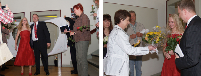 Bevor das junge Glück die Kollegenschar zum Sekt einlud, musste allerdings noch ein Schnitt gemacht werden. Es galt ein Herz aus einem Laken, das von den Dezernenten Wolfgang Dreyer und Herbert Stiller mehr oder weniger ruhig gehalten wurde, herauszutrennen. Frau und Herr Kleinewig meisterten die Aufgabe bereits mit beeindruckender Synchronität und verdienten sich dafür einen Strauß roter Rosen.