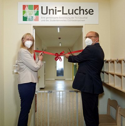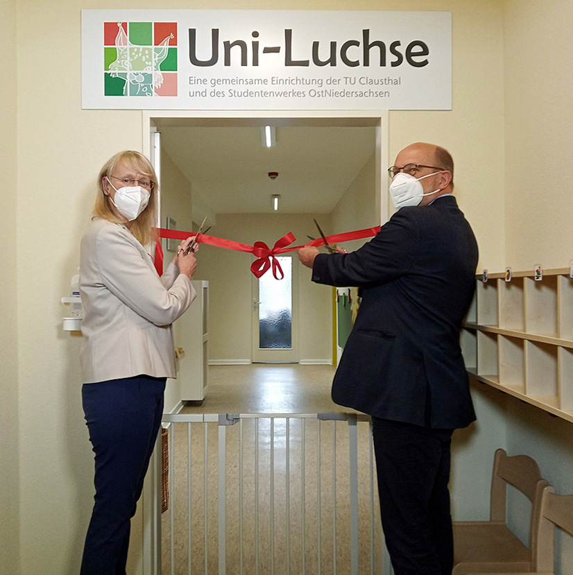Da aufgrund der Covid-19-Pandemie keine Eröffnungsfeier stattfinden konnte, ist ein Video gedreht worden, um die neue Großtagespflege vorzustellen. Das feierliche Durchtrennen des roten Bandes zur Eröffnung haben sich Professorin Heike Schenk-Mathes und Cord von Frieling jedoch nicht nehmen lassen. Bei dem Termin wurde die Zusammenarbeit zwischen dem Studentenwerk und der TU Clausthal mit einem Vertrag über die erweiterte Kooperation besiegelt.