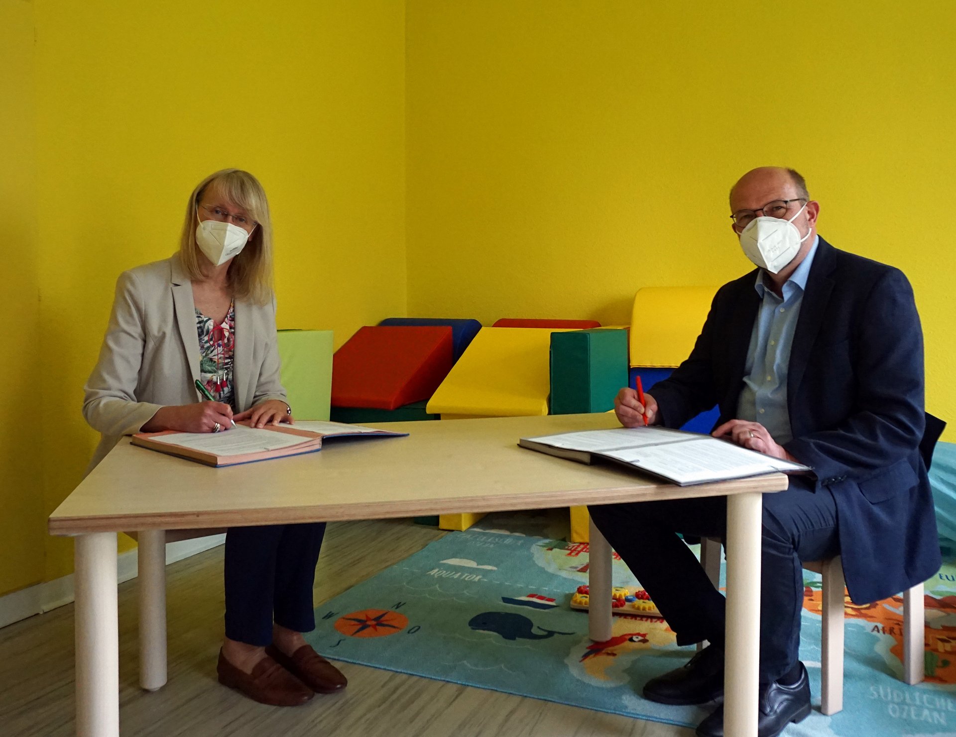 Professorin Heike Schenk-Mathes, Vizepräsidentin für Gleichstellung und Förderung des wissenschaftlichen Nachwuchses an der TU Clausthal, und Cord von Frieling, stellvertretender Geschäftsführer des Studentenwerks OstNiedersachsen, bei der Eröffnung der neuen Einrichtung für Kinder. Daneben haben beide Seiten einen Kooperationsvertrag unterschrieben (siehe auch Bilder unten). Fotos: Tatjana Methfessel