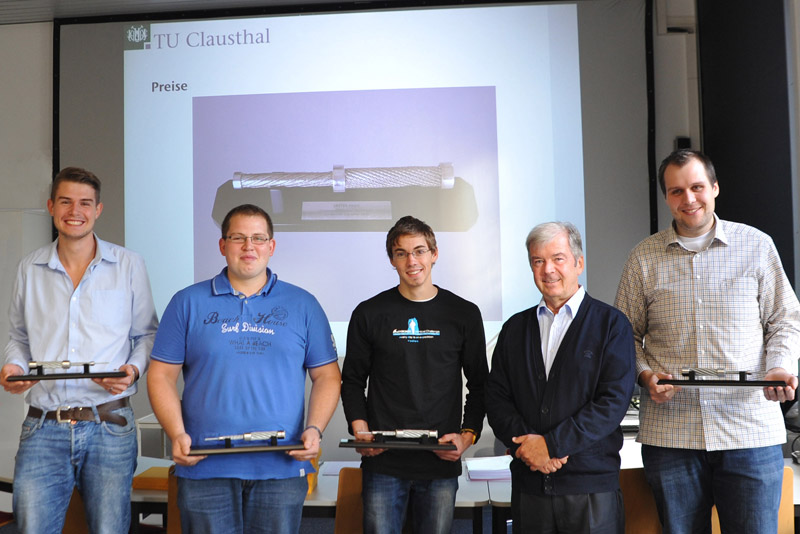 Ausgestattet mit dem Wissen aus der Lehrveranstaltung machten sich die Studierenden in Gruppen daran, die gestellte Aufgabe zu lösen. Unter den eingereichten Projektarbeiten vergab die Jury, zu der neben Verreet Professor Armin Lohrengel, Diplom-Ingenieurin Martina Wächter und Martin Schulze, B. Sc., gehörten, zwei Mal die Note „Sehr gut“. Eine Gruppe hatte als Lösung ein Flaschenzugsystem mit vier Seilen vorgeschlagen, die andere eine Seiltrommel, die mobil und stationär eingesetzt werden kann. „Beide Siegerteams sind sehr systematisch vorgegangen“, lobte Verreet. Neben der guten Note erhielten Alexander Thies, Thomas Kühlmann und Robert Sauthoff sowie die zweite Gruppe mit David Chorzewski und Tobias Römer jeweils eine Drahtseil-Trophäe und Bücher.