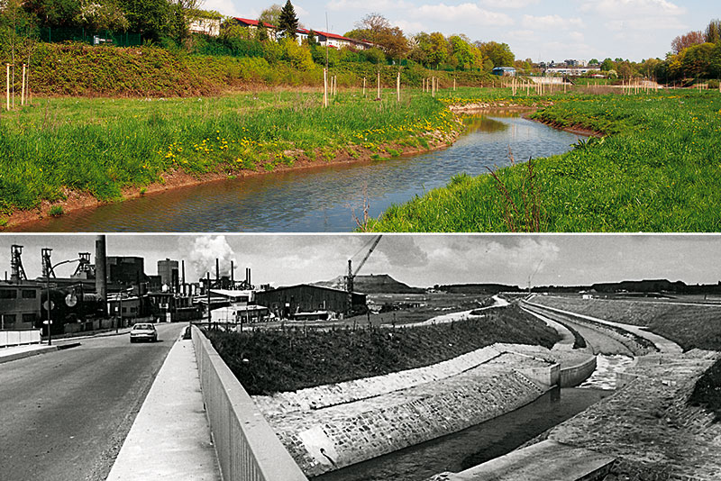 „Die an der Emscher liegenden Stadtteile, bisher sozial benachteiligt, erfahren ebenfalls einen Wandel“, sagt Landschaftsarchitektin Oldengott aus dem Vorstandsbüro der Emschergenossenschaft, „sie werden vom Hinterhof zum Vorgarten der Region.“ Zum Umbau des Gewässersystems gehören auch der Bau unterirdischer Abwasserkanäle und die Umgestaltung alter Klärwerke zu modernsten biologischen Anlagen. Aus ihnen wird nicht nur gereinigtes Abwasser in den Fluss zurückgeführt. Im Rahmen der Klärschlammverwertung erzeugt die Emschergenossenschaft einen Großteil der Energie, die ihre Anlagen benötigt, gleich selbst vor Ort.