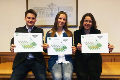 Freudestrahlende Gesichter bei Corinna Bischof (Studienfach Werkstoffwissenschaften), Tobias Bick (Wirtschaftsingenieurwesen) und Tetyana Laba (Chemie). Stellvertretend für die 42 Stipendiaten erhielten die drei Clausthaler Studierenden im Senatssitzungszimmer aus den Händen von Herbert Stiller, dem Leiter des Studienzentrums, jeweils einen symbolischen Scheck über 500 Euro. Gibt es schon Pläne, wofür das Geld genutzt wird? Ein Teil der Summe - da war sich das Trio einig - werde in Weihnachtsgeschenke umgesetzt. Alle drei haben als Voraussetzung für die Förderung in ihren Fächern überdurchschnittliche Leistungen gezeigt. Tobias Bick bringt sich daneben umfangreich in die Freiwillige Feuerwehr Herzberg ein.