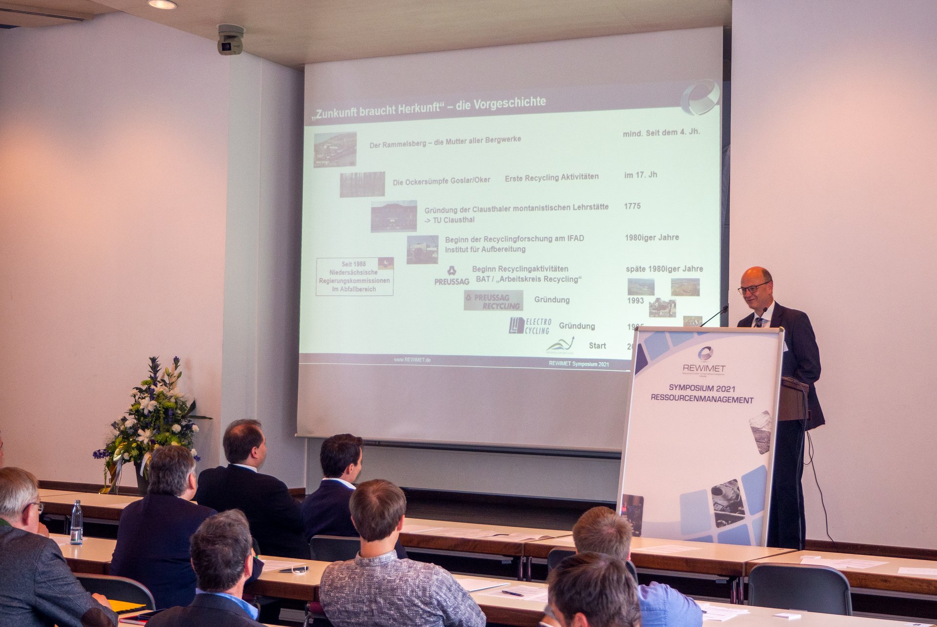 Das Symposium wurde vom REWIMET e.V., Recycling-Cluster wirtschaftsstrategische Metalle, ausgerichtet. Zahlreiche Vorträge gaben Einblicke in die neuesten Forschungsergebnisse zum klimaschonenden Ressourcenmanagement. Die thematischen Schwerpunkte waren das Recycling von Gips, Metallen und Batterien. Professor Daniel Goldmann, Leiter des Instituts für Aufbereitung, Deponietechnik und Geomechanik (IFAD) der TU Clausthal hielt einen Vortrag über zehn Jahre REWIMET.