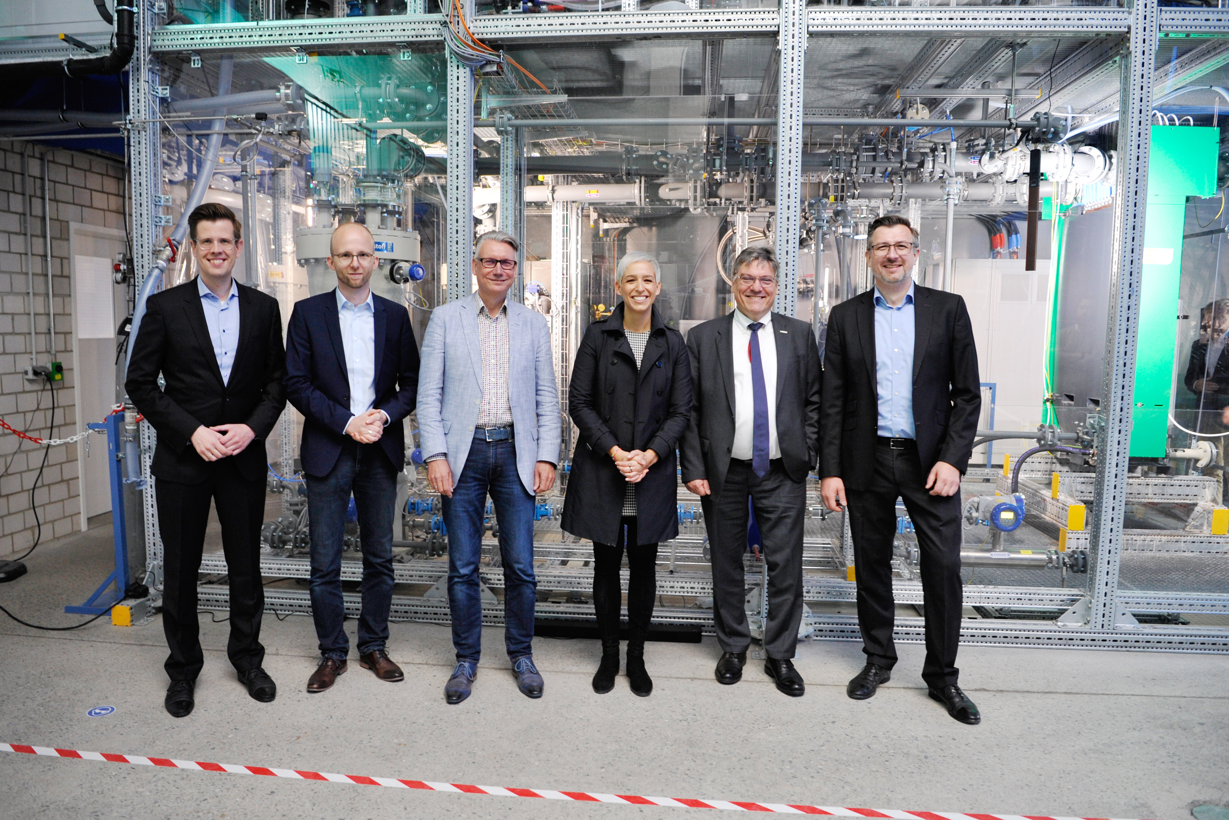 Eröffnung des Elektrolyse-Testfeldes (von links): Dr. Lukas Lüke (WEW), Dr. Maik Becker (TU Clausthal), Prof. Thomas Turek (TU Clausthal), Dr. Wiebke Lüke (WEW), Universitätspräsident Prof. Joachim Schachtner und Dr. Gregor Polcyn (WEW). Rund 30 Gäste aus Wissenschaft und Wirtschaft (siehe auch Bilder unten) waren bei der Veranstaltung im Forschungszentrum Energiespeichertechnologien dabei. Fotos: Christian Ernst