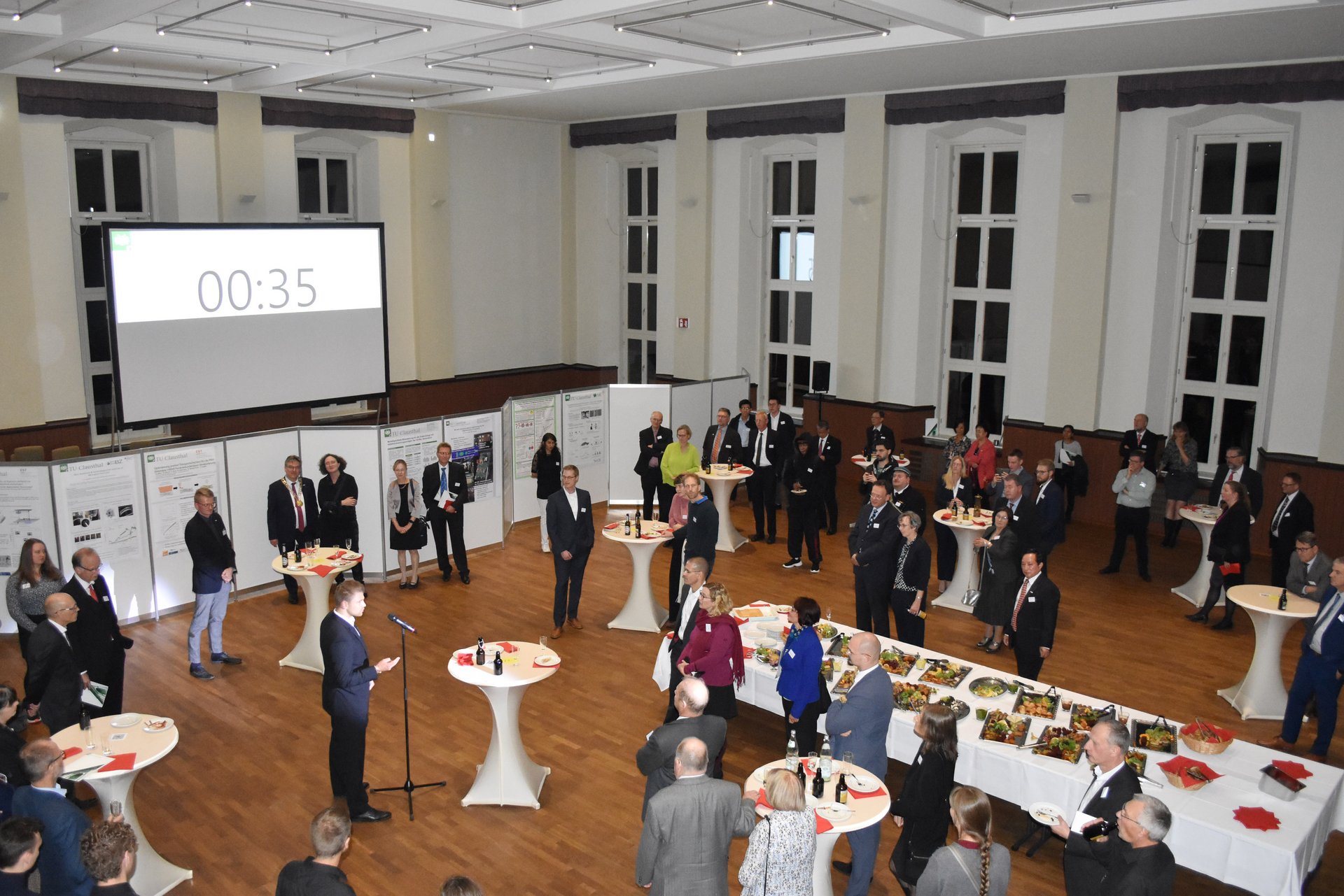 Bei einem Glas Bier der TU-Forschungsbrauerei von Prof. Frank Endres verfolgten die Gäste, wie sieben aktuell Promovierende (Frederik Droste-Rehling, Hendrik-Johannes Stromberg, André Hebenbrock, Ye Yue, Alexander Gödde, Sebastian Sdrenka und Lars Henry Fischer) ihre Forschung unterhaltsam in zwei Minuten auf den Punkt brachten und dafür viel Applaus ernteten. Das „coole“ (O-Ton einer Studentin) Netzwerk-Event mit Feierstunde klang mit dem traditionellen Clausthaler Mitternachtsschrei, vorgetragen von Martin Ksink, aus.